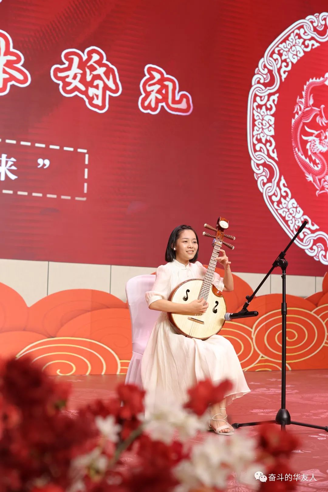 “從此刻起,你們正式成為結(jié)發(fā)夫妻,禮成!”儀式結(jié)束也把氛圍推到了沸點。大家紛紛摩拳擦掌想上臺為新人送上祝福,這邊2022屆大學(xué)生代表秦碧徽和她的男朋友姚云飛為新人獻上了一曲中阮彈唱,祝福新人幸福天長地久。那邊新娘閆寧寧一首《約定》唱出了愿得一人心、白首不相離的相約。臺上還進行了投壺、花開富貴等游戲。