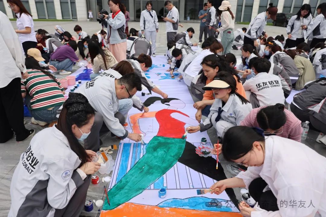 隨著畫布的鋪開,第二個項目開始。活動中,大家拿起手中的畫筆,端起五顏六色的顏料,在畫布上恣意揮灑著自己的熱愛與赤誠。通過近1小時的共同創(chuàng)作、潛心描繪,巨畫逐步完成,每一筆都體現(xiàn)出華友人的風采與魅力,每個人都是這幅巨畫誕生過程中不可或缺的一環(huán)。