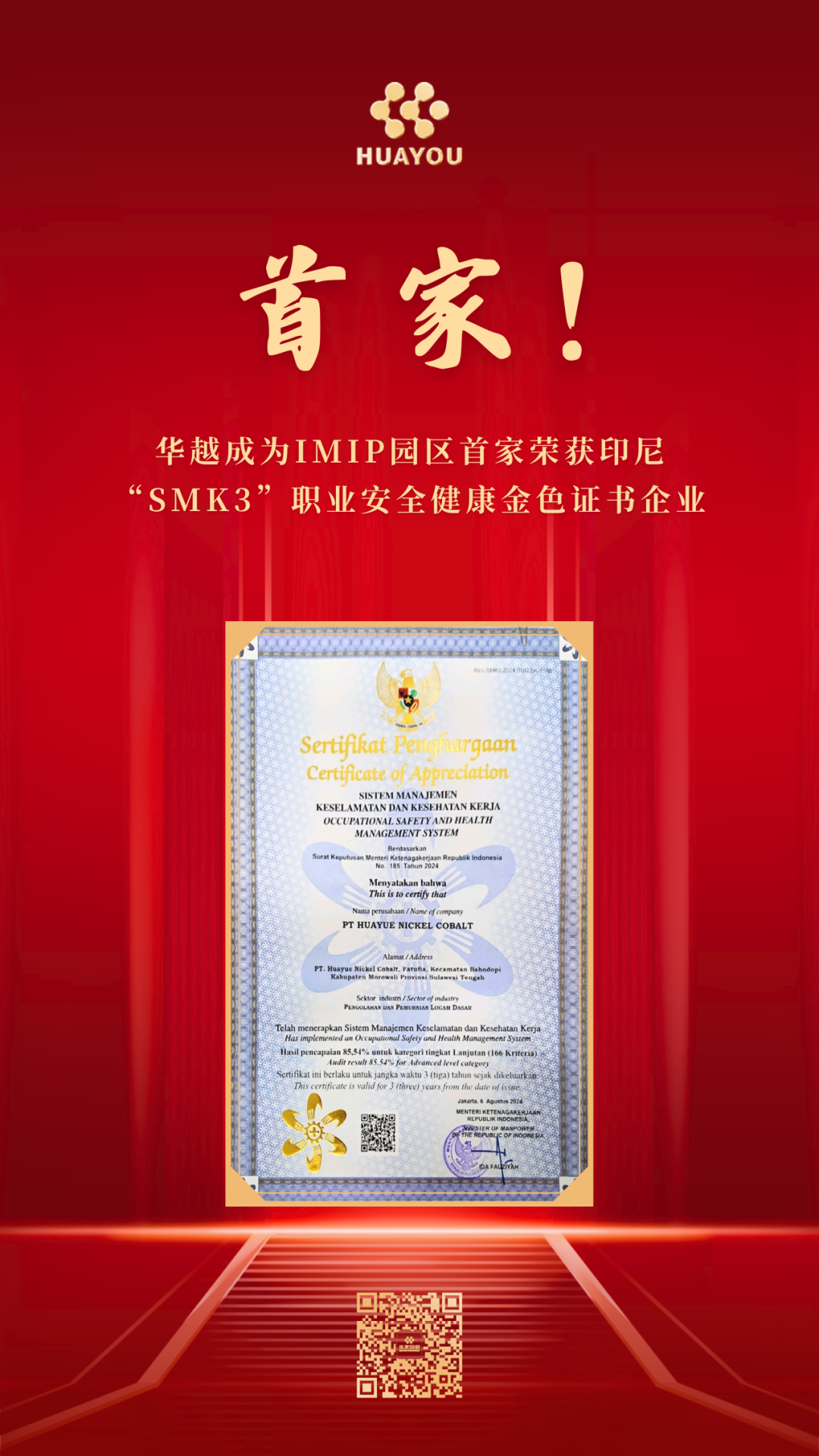 9月9日,華越鎳鈷(印尼)有限公司正式通過審核,獲得印尼勞工部頒發(fā)的“SMK3職業(yè)安全健康”金色(最高等級)證書,成為IMIP園區(qū)50多家qm球盟會·(中國)球盟會中首家獲此認證的qm球盟會·(中國)球盟會。