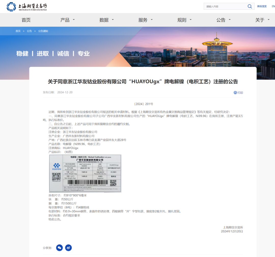 12月20日,華友鈷業(yè)子公司廣西華友新材料有限公司生產的“HUAYOUgx”牌電解鎳(電積工藝,Ni99.96)成功在上海期貨交易所(以下簡稱“上期所”)注冊,注冊產能為3萬噸。
