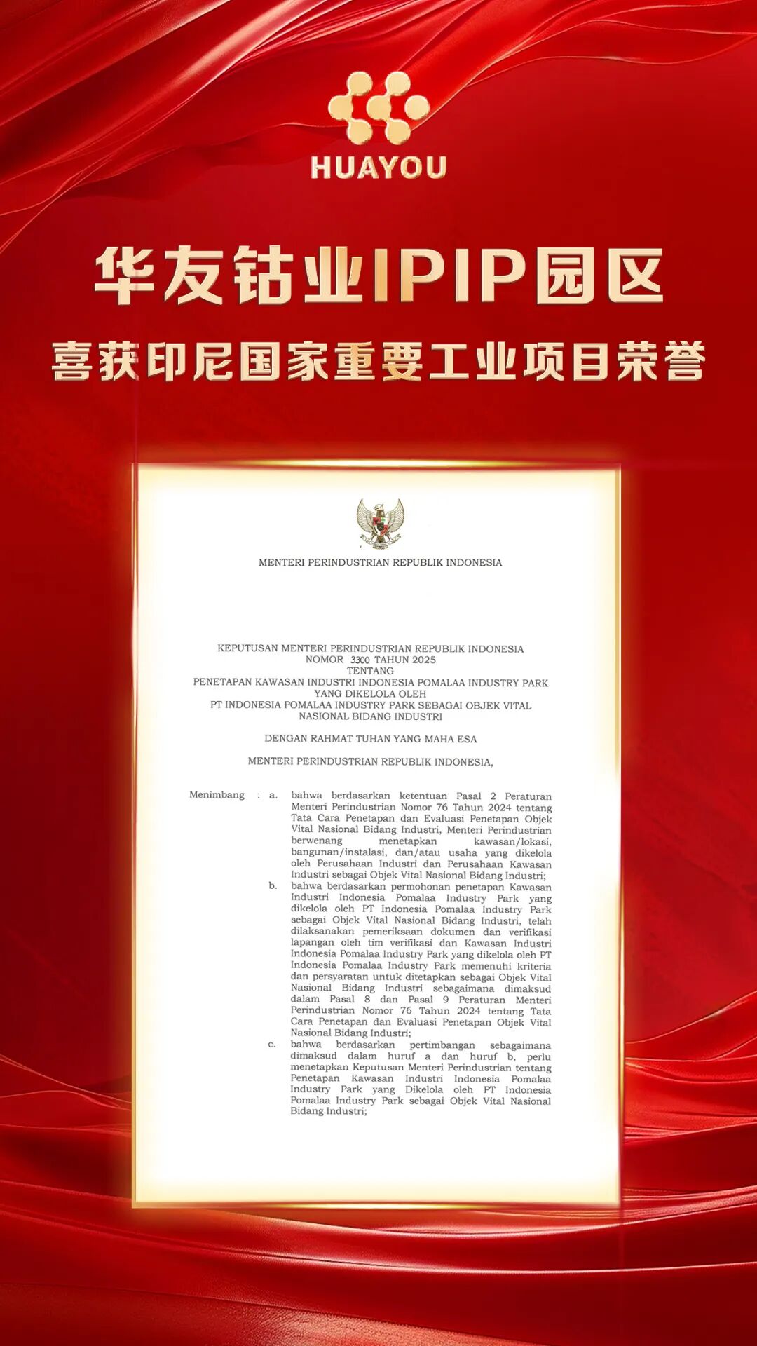 國家級認可!華友IPIP園區(qū)獲印尼國家重要工業(yè)項目榮譽