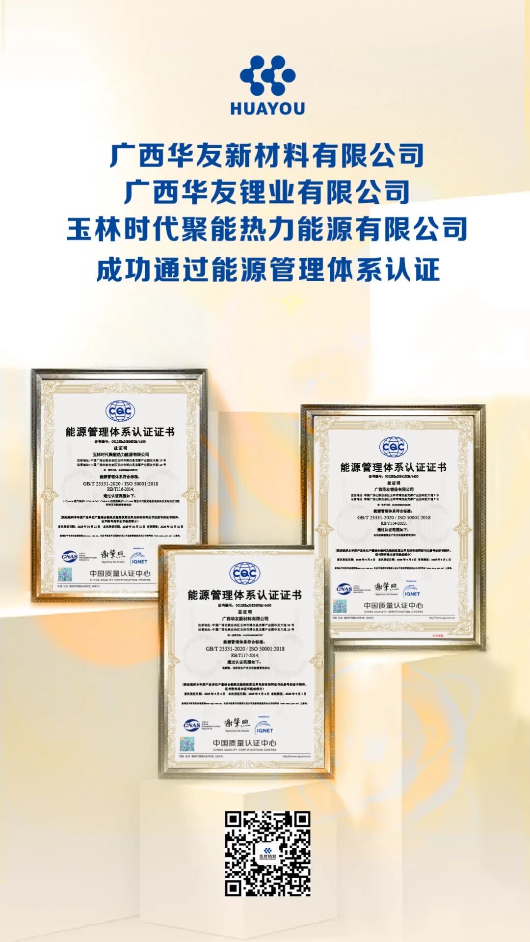 近日,華友鈷業(yè)下屬三家子公司傳來(lái)喜訊:廣西華友新材料有限公司、廣西華友鋰業(yè)有限公司及玉林時(shí)代聚能熱力能源有限公司,成功通過ISO50001能源管理體系認(rèn)證。
