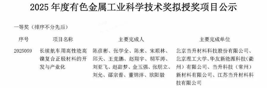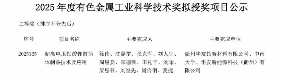 近日,2025年度中國有色金屬工業(yè)科學(xué)技術(shù)獎獲獎名單揭曉,華友鈷業(yè)憑借兩大核心產(chǎn)品的技術(shù)突破與產(chǎn)業(yè)化深耕,斬獲兩大獎項。其中,華友鈷業(yè)與北京當(dāng)升材料科技股份有限公司聯(lián)合攻關(guān)的“長續(xù)航車用高性能高鎳復(fù)合正極材料的開發(fā)與產(chǎn)業(yè)化”項目,榮登一等獎榜單;由衢州華友鈷新材料有限公司牽頭,華友新能源科技 (衢州) 有限公司深度參與的“超高電壓鈷酸鋰前驅(qū)體制備技術(shù)及應(yīng)用”項目,斬獲二等獎。